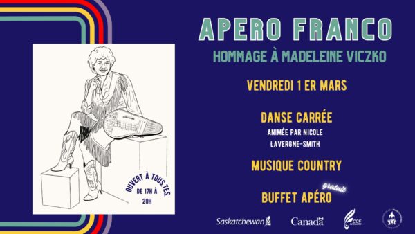 La Fédération des Francophones de Saskatoon et la Communauté Culturel Fransaskoise vous accueille ce vendredi 1 Mars pour un apéro spécial Retrouvez-nous durant une soirée dansante et costumée pour rendre hommage au parcours de Madeleine Viczko autrice de la chanson mélodieuse « Bonjour Saskatchewan ». Une activité amusante et informative, animée par Nicole Lavergne Smith. Les apéros franco sont ouverts à toutes et à tous, petits et grands. C’est le moment idéal pour échanger en français et faire de nouvelles rencontres. Sur place des boissons et de la nourriture vous seront proposées