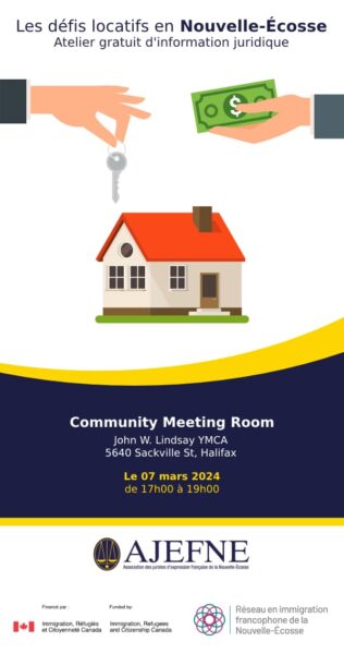 L’Association des juristes d’expression française de la Nouvelle-Écosse AJEFNÉ organise cet atelier d’information juridique en collaboration avec Immigration Francophone Nouvelle-Écosse IFNÉ et Réseau en immigration francophone de la Nouvelle-Écosse RIFNÉ, dans le cadre du mois de la francophonie. Les locataires et les locateurs ont l’un envers l’autre des responsabilités ainsi que des obligations. Notre avocat consultant Maitre Nicolas Leblanc va mettre en avant, tout ce que vous devez savoir en matière de location de biens immobiliers à usage d’habitation en Nouvelle-Écosse.