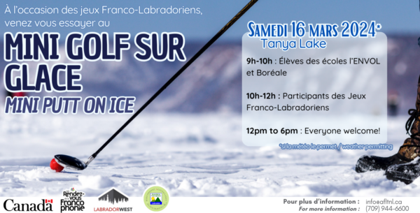 Sur le lac Tanya, zone récréative très fréquentée, l’Association francophone du Labrador créera, à l’aide de pelles et de souffleuses, un parcours de mini-golf dont les familles pourront profiter le temps d’une journée. Le parcours servira en avant-midi dans le cadre des Jeux franco-labradoriens, mais sera ouvert à la population en général en après-midi.