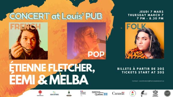 La Fédération et le Conseil Culturel Fransaskois vous donnent rendez-vous le 7 mars à 19h au Louis’ Pub pour découvrir nos auteurs-compositeurs-interprètes francophones lors de ce concert inoubliable mettant en vedette Étienne Fletcher, Éemi et Melba !