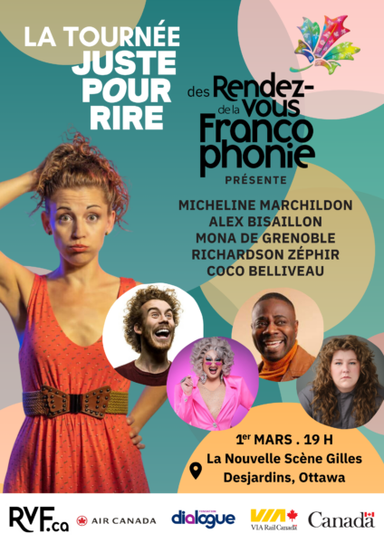 La Tournée Juste pour rire s’arrête chez vous? Ne manquez pas ce rendez-vous annuel d’humour francophone! Voyez Micheline Marchildon, Alex Bisaillon, Mona De Grenoble, Richardson Zéphir et Coco Belliveau, le 1er mars prochain à Ottawa. Les détails de la billetterie seront ajoutés sous peu!
